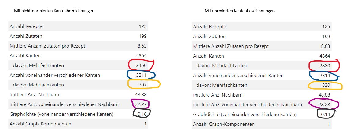 MultiGraph. Jede Kante trägt einen (nicht eindeutigen) Bezeichner, der aus den beiden jeweils eindeutigen Bezeichnern der Knoten zusammengebaut wird, die diese Kante verbindet. Der Kantenbezeichner wird so gebaut, dass der Knotenbezeichner, der zuerst im Alphabet kommt, auch zuerst im Kantenbezeichner steht. Ein Beispiel: Die Kante, die die Zutat mit dem Bezeichnerartischockemit der Zutat mit dem Bezeichneressigverbindet, trägt den Bezeichnerartischocke--essig(und nicht:). Ich nenne diese Art von Kantenbezeichnern "normierte Bezeichner". Dank der normierten Kantenbezeichner ergeben sich Graph-Kennzahlen, wie sie auch vom Programm Gephi errechnet werden. Im Bild sieht man einen Vergleich der Kennzahlen mit nicht-normierten und normierten Kantenbezeichnungen.essig -artischockeDoch nun zum Problem: Zuordnung von Bezeichnern zu den Kanten des mathematischen Graphen. Leider bin ich über einige Probleme im jsnx-API bzw. in der zugehörigen Dokumentation gestolpert.